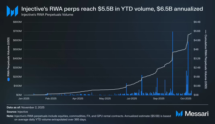 · The Surge of RWA Perpetual Contracts: According to Messari's research, the trading volume of RWA perpetual contracts on Injective has surged, with the annualized trading volume expected to soar to $6.5 billion. This proves that its infrastructure can support institutional-level large-scale real asset trading.
