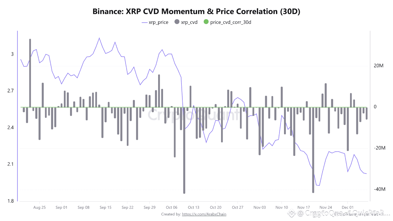 Data from Binance, the leading trading platform, shows that Ripple is going through a sensitive period characterized by weak price momentum and a shift in liquidity flows. XRP is trading around $2, while the CVD indicator has registered a sharply negative value of -5.9 million, reflecting the clear dominance of selling pressure over the past few weeks and a weakening balance of power between buyers and sellers in favor of the downward trend.