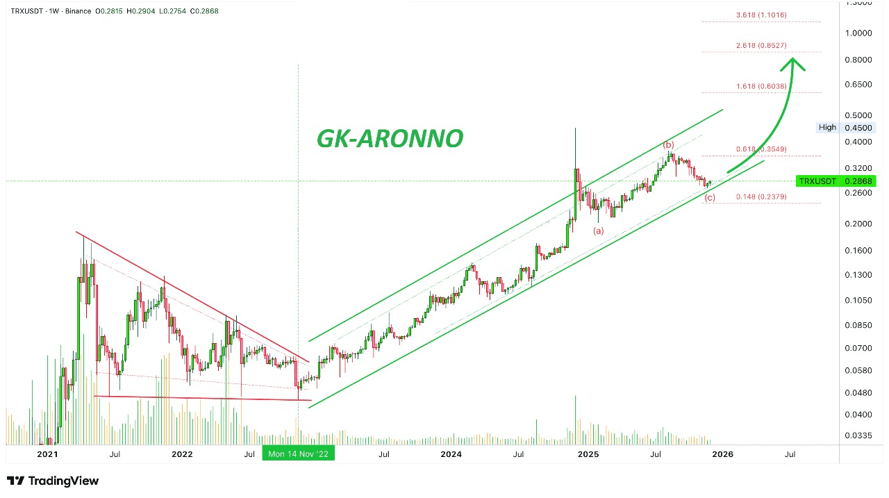 TRX reached its all-time high in December 2024. This was not a signal of the end of the bullish trend for this pair. While a lower high appeared in August 2025 based on the candle wick, the bullish trend remains intact based on the candle closes - August 2025 produced a higher high. TRXUSDT continues to rise in the long term.