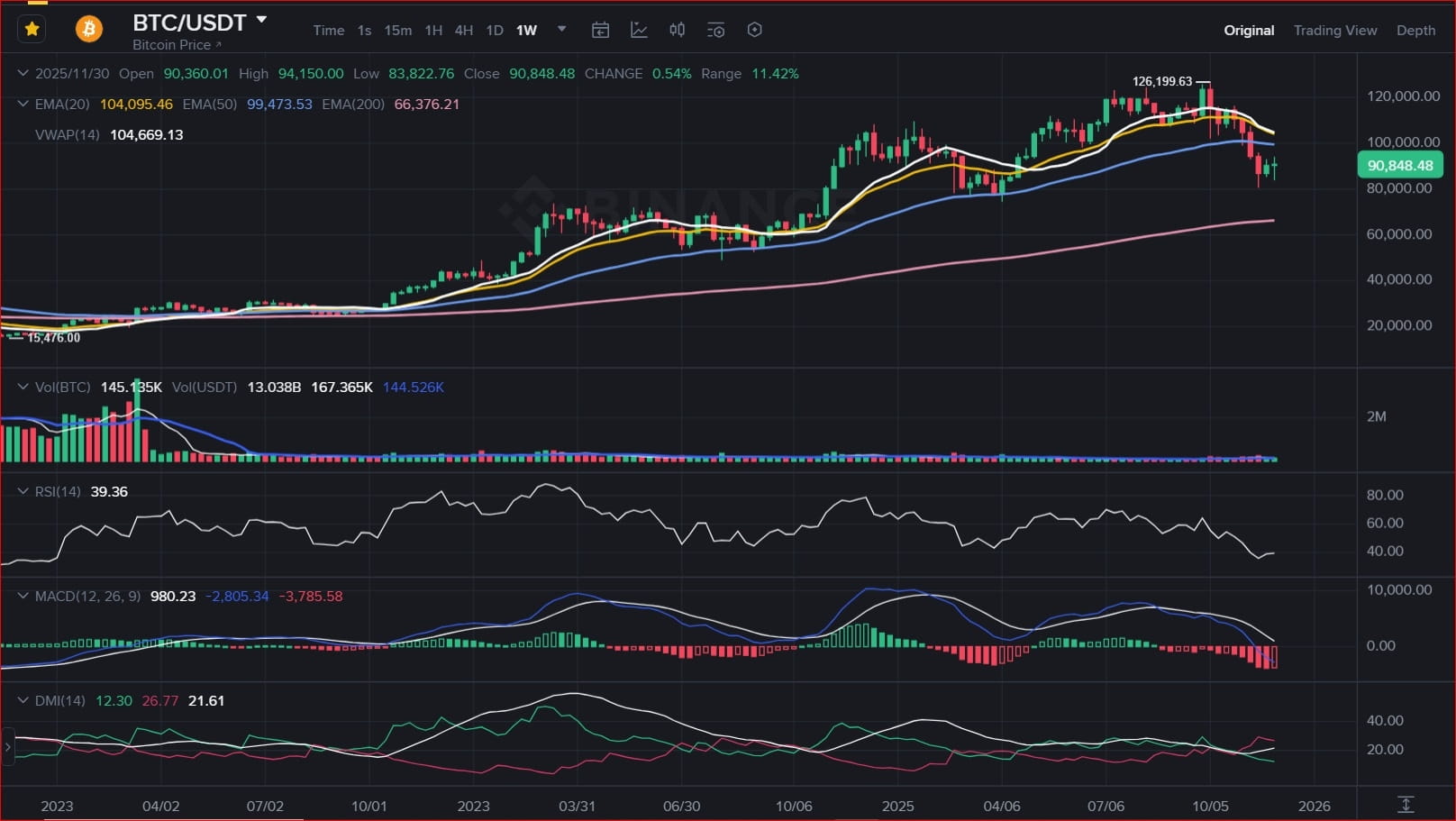 • ❌ Massive Resistance: We are closing the week at $90,800, well below the 50 EMA (Light Blue Line) which is at $99,470. This line now acts as a formidable ceiling.