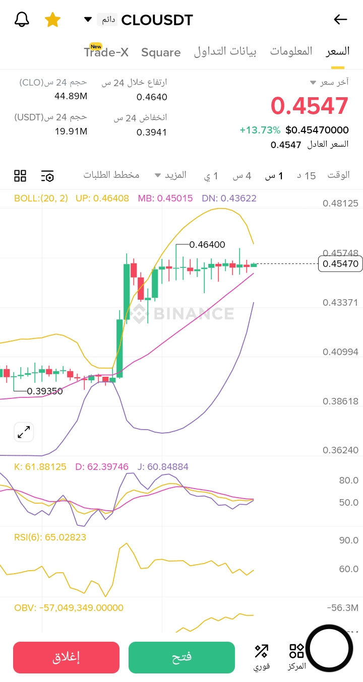 The CLO-USDT pair shows clear bullish strength after forming a bottom at 0.43826. The increase of 13.70% over 24 hours reflects strong positive momentum. The price currently appears to test a nearby resistance level at 0.45500, and may experience some short-term correction.