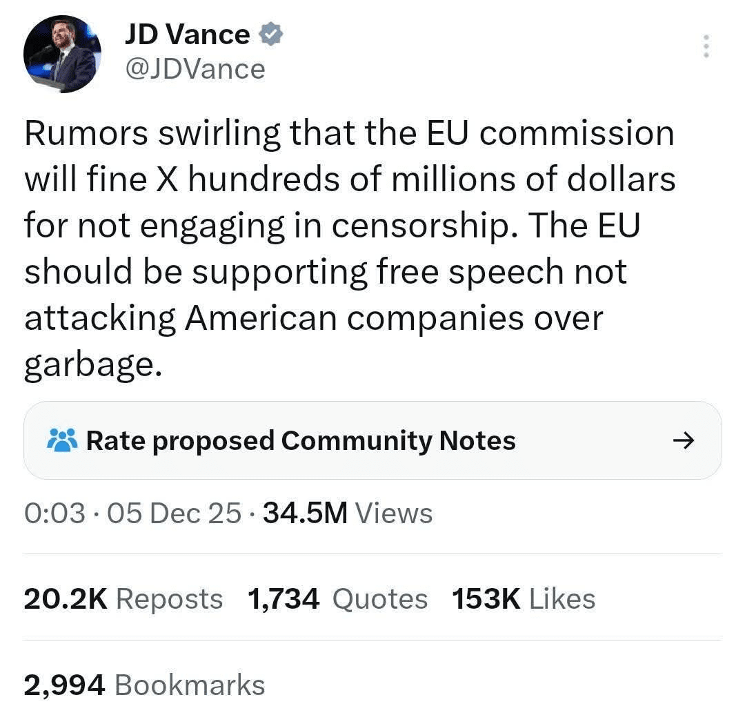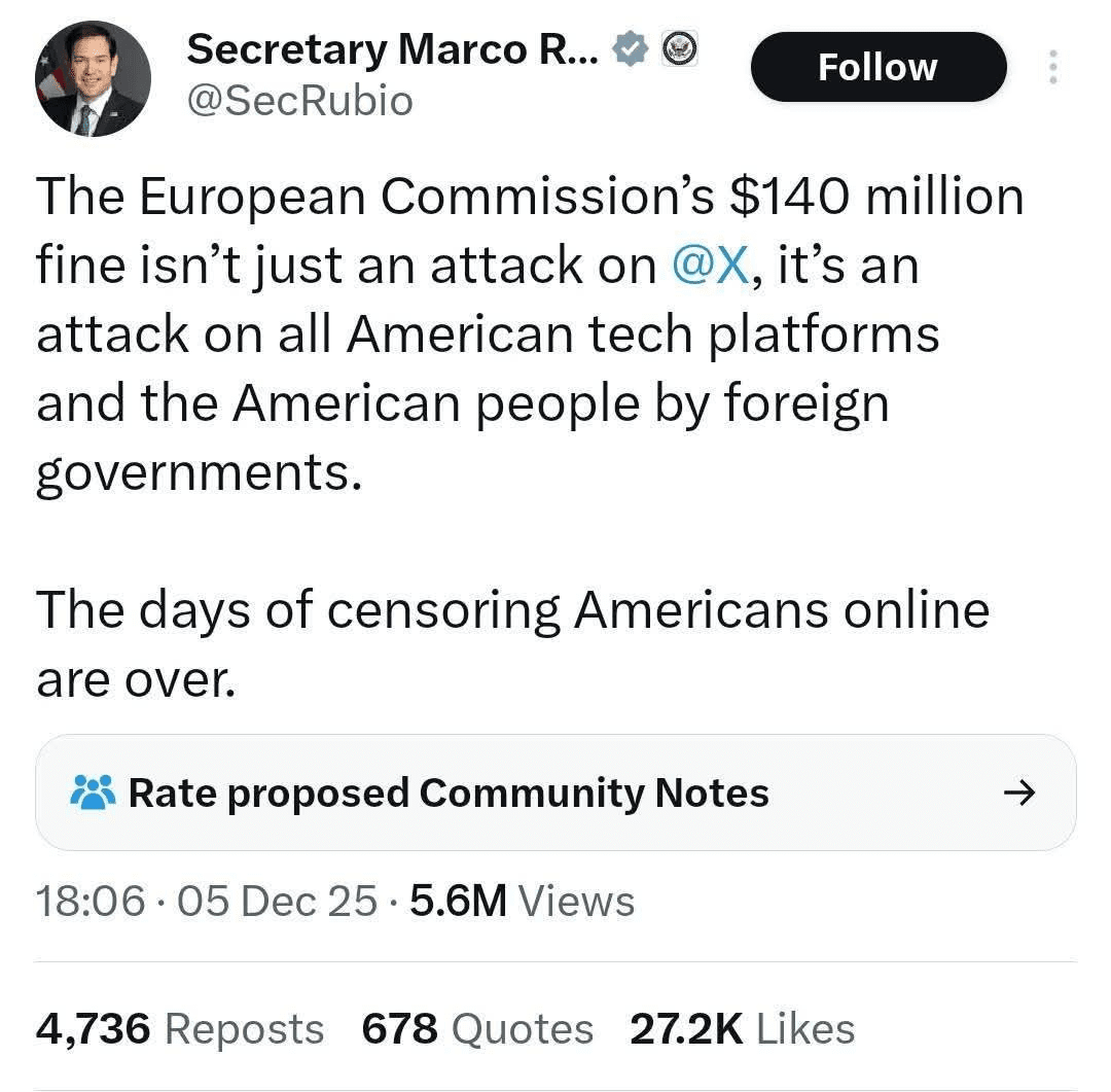 •The reaction of the USA: American politicians like Marco Rubio and JD Vance defined the fine as an "attack against America."