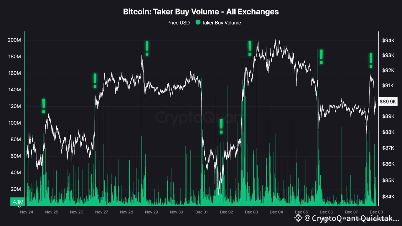 Bitcoin’s Taker Buy Volume has surged repeatedly over the past two weeks, showing clear signs of aggressive market buying during both rallies and sharp pullbacks. This metric tracks the volume of trades where buyers “take” liquidity, meaning they are actively willing to pay the market price. High readings often reflect momentum traders, large buyers, or forced short covering stepping in.