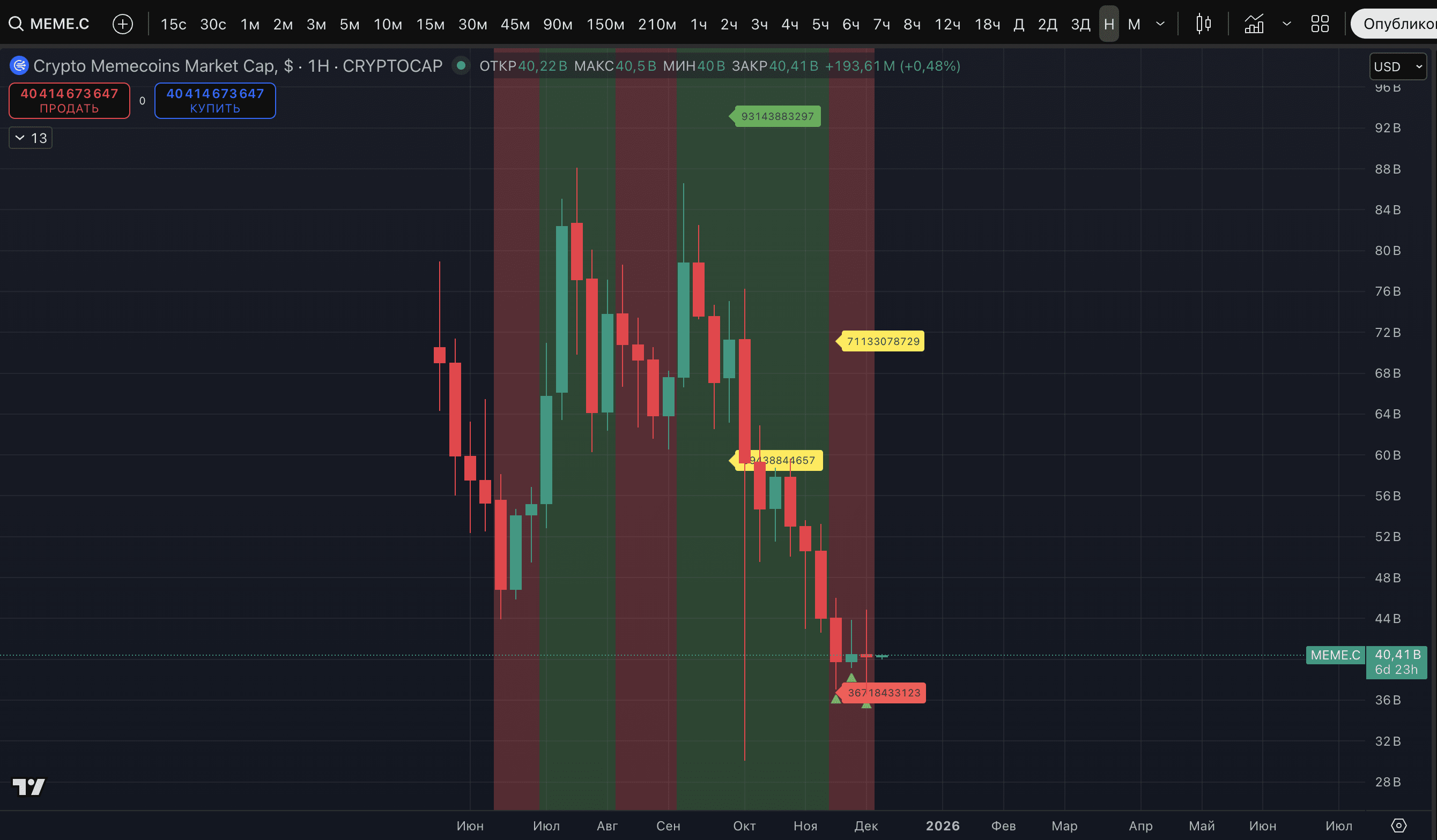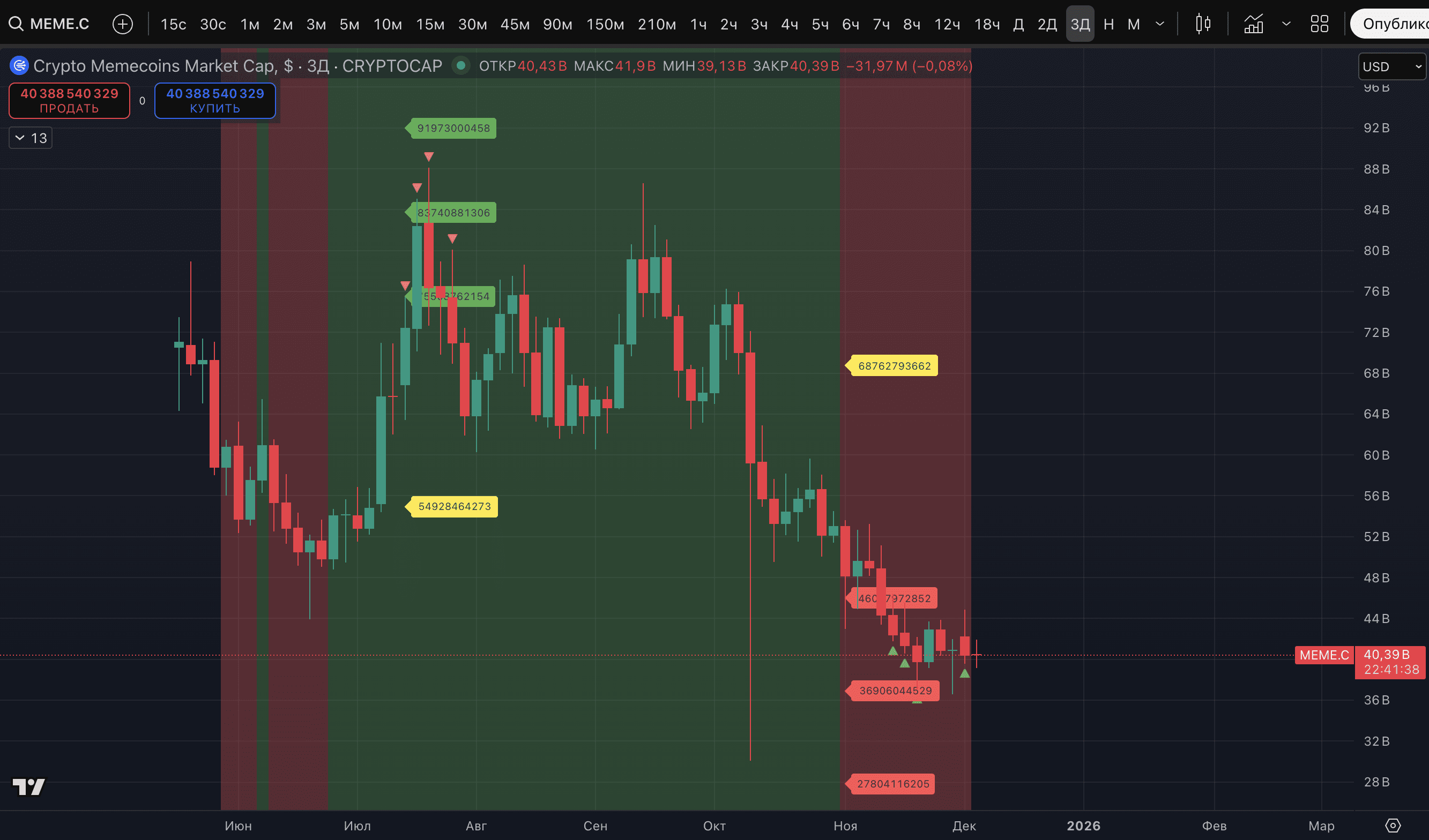 Also, let us remind you, MEME.C (capitalization of meme coins) has three low marks + a fourth additional one on the 3-day timeframe and three on the weekly timeframe.