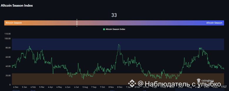 Последние данные показали, что сезон альткоинов ещё не начался. На момент наблюдения индекс сезона альткоинов достиг 33 пунктов.