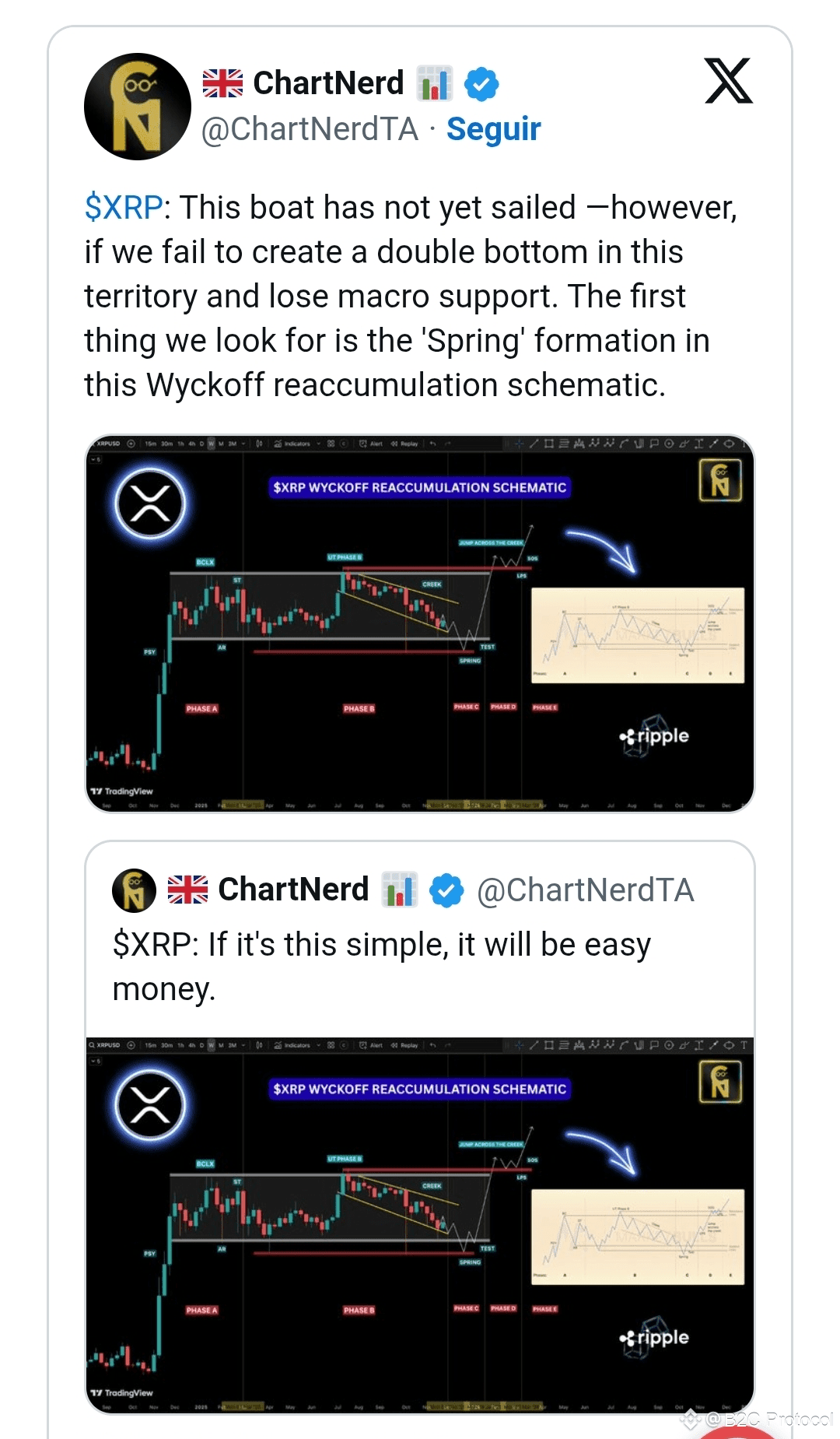 O XRP está sendo negociado próximo ao suporte macro no gráfico. Esse suporte define o limite inferior da faixa de reacumulação. O analista acompanha esse padrão há algum tempo e observou que o XRP precisa formar um fundo duplo nessa região para manter a estrutura atual. Se o preço romper esse nível, os traders esperam um evento de primavera.