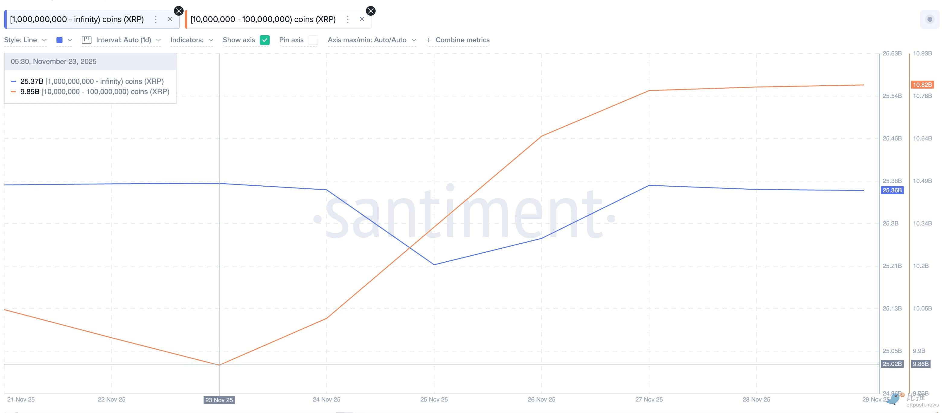 Addresses holding 100 million to 1 billion XRP have net increased by 970 million coins.