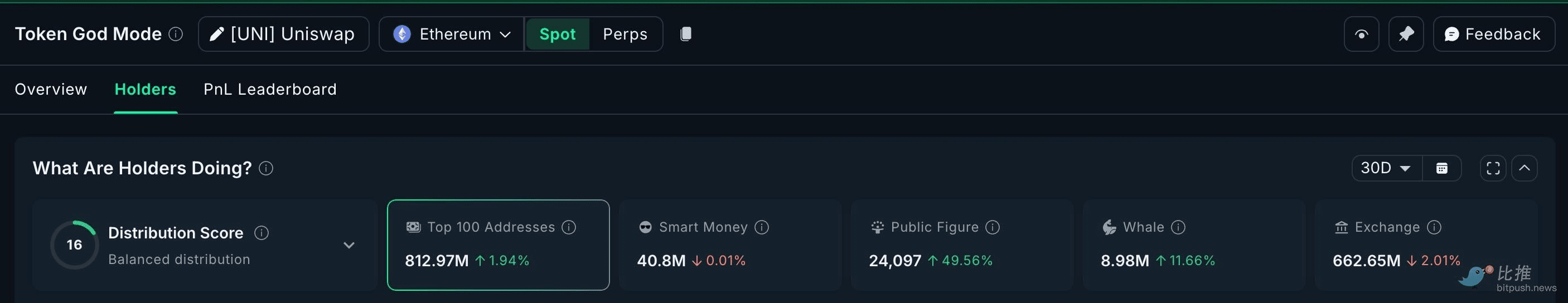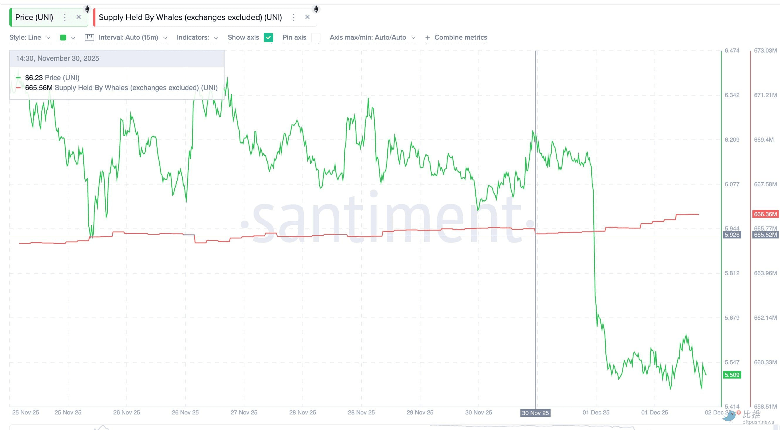 UNI: In the past week, whales added about 800,000 coins (worth nearly $5 million). After the fee switch vote passed, the top 100 addresses held a total of 8.98 million UNI, showing strong accumulation momentum, while the supply from exchanges has continued to decrease.