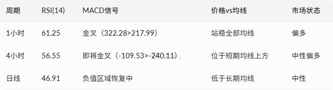 1-hour RSI is 61.25, not yet entering the overbought zone and still has upward space; 4-hour MACD histogram has turned from negative to positive, expanding to 130.58, showing a switch in momentum; although the daily MACD is still negative, the histogram continues to narrow, reflecting reduced selling pressure.