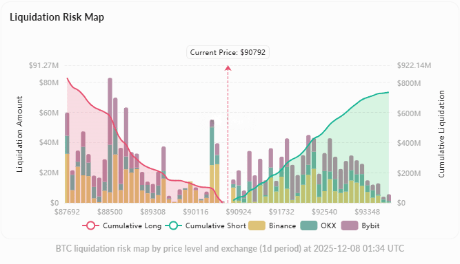 The liquidation risk chart shows that there is $838M of long positions accumulated below the current price of $87,692, which could trigger a chain liquidation if broken; above, the range of $90,823-$93,752 has accumulated short positions exposed at $741M, which could trigger a short squeeze after breaking.