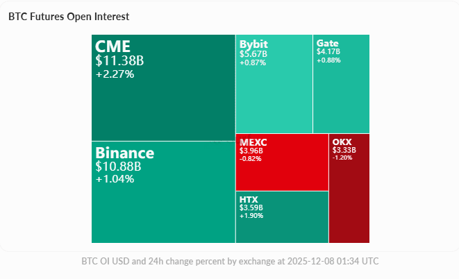 Total open interest $57.69B, increasing by 2.17% over 24 hours, indicating increased market participation. In terms of funding rates, Binance -0.000297 and Bybit -0.000827 are both negative (long position charging model), while OKX +0.000180 is slightly positive, overall leaning towards bullish expectations.