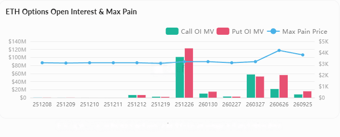 Options market: Open interest $10.85 billion, 24-hour trading volume surged by 101.5%. The maximum pain point for options expiring on December 12 is $3,100, and prices may approach this level before expiration. Deribit holds 68.49% market share, with significantly increased activity.