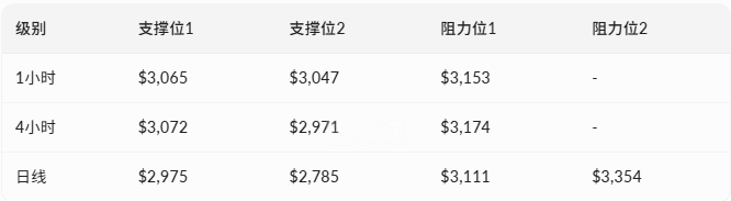 Daily level: Price broke through the middle Bollinger Band ($2,975) but was resisted by EMA26 ($3,111) and SMA50 ($3,354), indicating that the daily level is still in a descending channel. Although the MACD has shown a bottom divergence (the histogram expanded from -109 to 44.41), the main line remains negative (-65.48), and it needs to be observed whether it can effectively turn positive. The RSI is at 49.76, neutral and slightly weak.