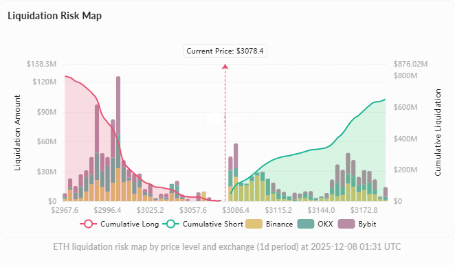 Liquidation risk: Accumulated $796 million long liquidation risk below $3,000 and accumulated $650 million short liquidation risk above $3,187. The current price is situated between two major liquidation concentration zones; a breakout in either direction may trigger a chain liquidation, leading to accelerated market movements.