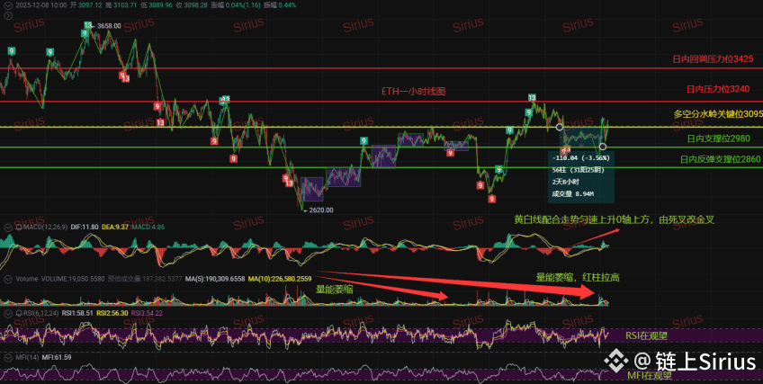 这里我 Sirius 的个人观点很明确: 我看多ETH的中长期,但短期,我判断它会 “先回调,再暴涨”。为什么?因为目前的价格(3090附近)刚刚突破多空分水岭3095,需要一次回踩来确认支撑是否牢固,洗掉不坚定的多头筹码,才能轻装上阵,拉盘更暴力。