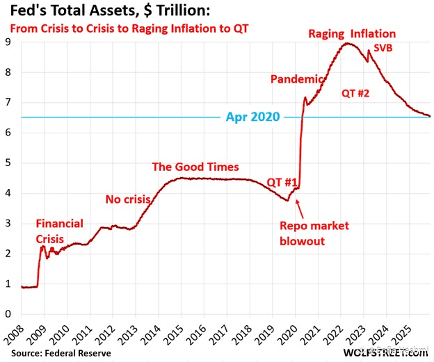 The Federal Reserve’s balance sheet dropped by $37 billion in November, falling to $6.53 trillion, its lowest level since April 2020. Over the past three years and five months, the Fed has been reducing its assets through a process called quantitative tightening (QT). In total, it has cut $2.43 trillion, which is about 27%, and this basically unwound half of the $4.81 trillion that was added during the pandemic stimulus period.