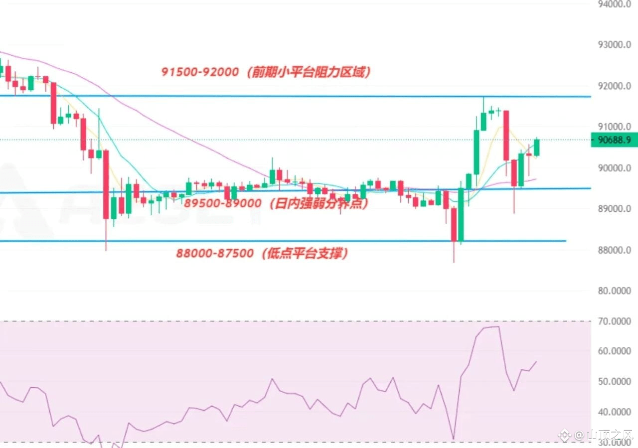 多方:若价格回踩88,500-89,000美元区间并出现企稳信号,可考虑轻仓介入,目标看向91,000-91,500美元。