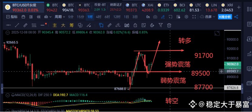 小周期内价格在89500美元上方表现相对强势,日内可按89500-91700区间震荡对待,直到出现明确破位信号。#BTC走势分析