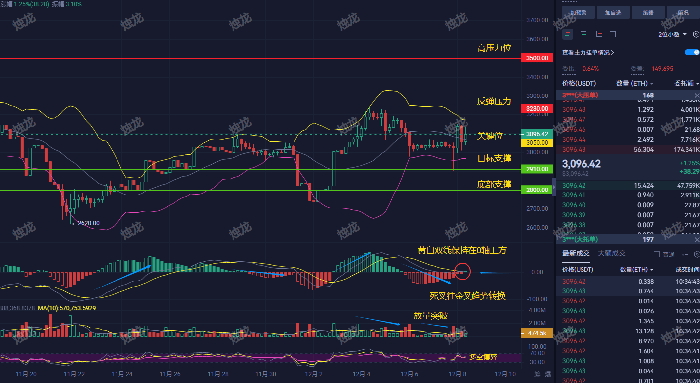 Today, as soon as I opened my eyes, I saw ETH quietly climbing again. The yellow and white lines on the four-hour chart have returned above the 0 axis, and the golden cross is stirring, clearly indicating that the bulls still want to make a move.