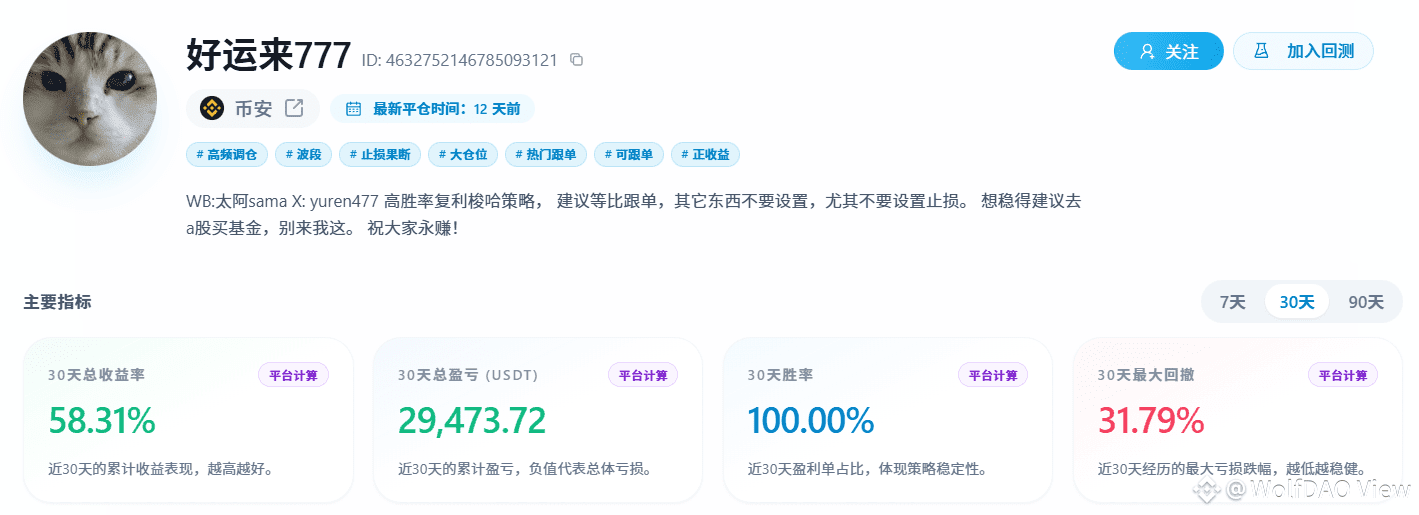 带单员 “好运来 777” 的公开交易数据呈现显著矛盾,个人盈利与跟单亏损形成强烈对比,为加密带单的风险与适配性提供了典型样本: