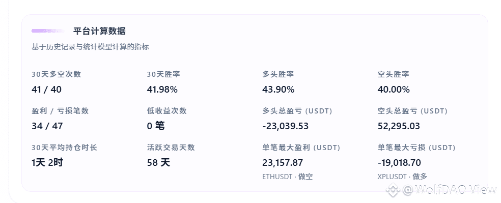 跟单市场反馈:跟单社区总盈亏 -201,988.98 USDT(超 20 万 USDT 亏损),名义胜率仅 41.46%,与 “高胜率” 自我描述存在差异。