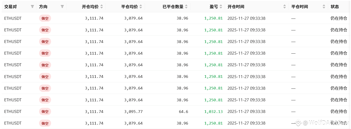 存在典型 “扛单” 行为:2025 年 11 月 6 日开仓的 ETHUSDT 空单,持仓长达 17 天 4 小时,最终盈利 22,600 USDT,靠长期持有亏损仓位等待市场反转。