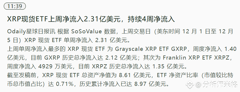 $XRP 现货ETF上周又吸金2.31亿美元,连续四周净流入,灰度一家就买了1.4亿美金! 这不是小打小闹,这是真金白银的机构押注。
