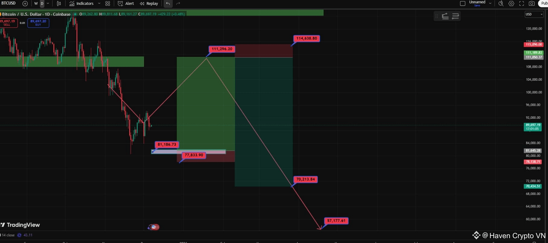 rơi thẳng về 7x từ vùng giá hiện tại.Mình đánh giá kịch bản này thấp hơn 2 kịch bản trên, vì:Đòn bẩy đã bị rửa khá nhiều,Vùng 8x đang là hỗ trợ tâm lý + on-chain tương đối rõ lực mua thật rất lớn.