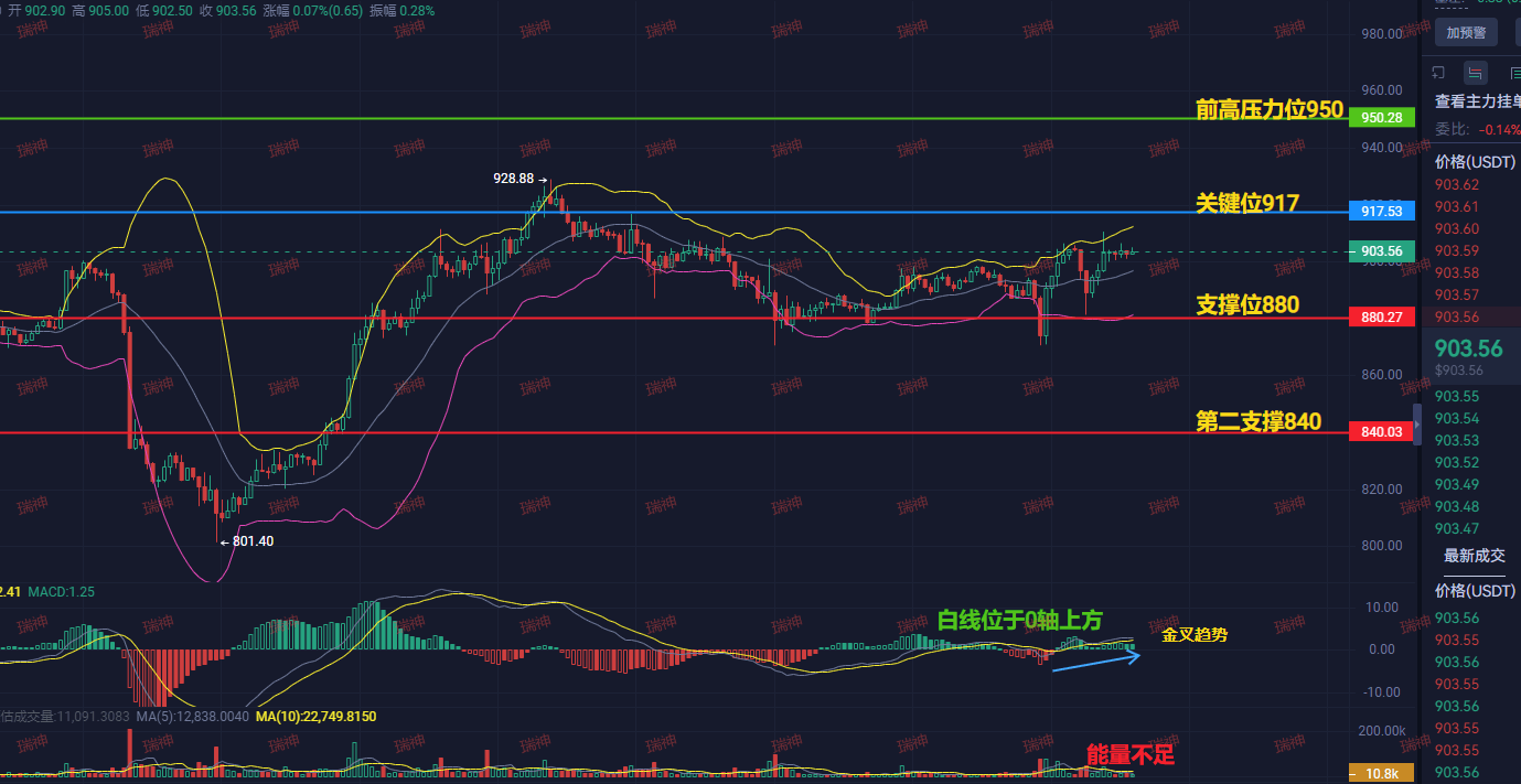 The one-hour chart is very clear: BNB is being pressed down hard by this key resistance at 917. Although the MACD has golden cross, the energy bars are unmoving, which is called 'no volume golden cross', a typical signal of weak upward momentum that can easily lead to a 'false breakout.'