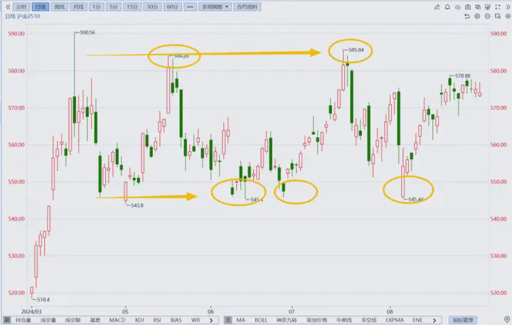 As shown in the figure, if you buy or sell in the circled area, using previous high and low points as take-profit and stop-loss points, then if you are wrong, the loss will be small; if you are right, you can capture a large segment of the market. By doing this long-term, you can eventually achieve profits.