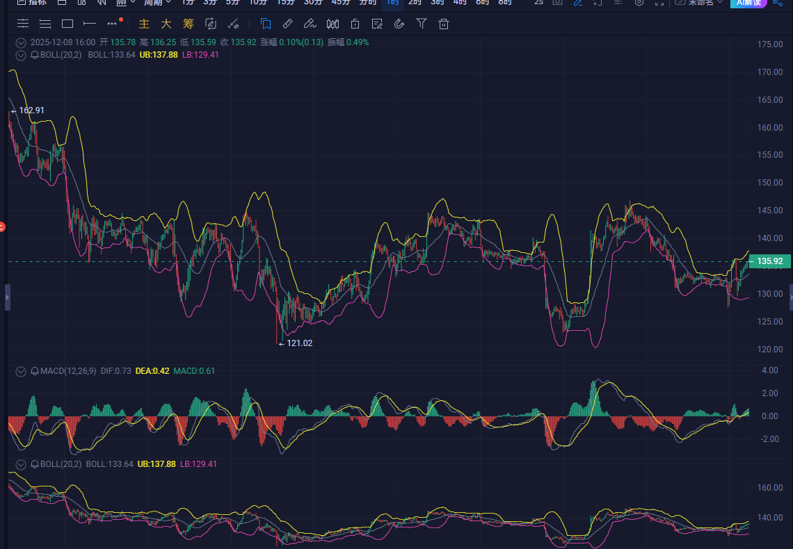 The current market is tightly choked by the BOLL bands—upper band at 137.9, lower band at 129.4, with the bandwidth minimized. This is not a consolidation; this is the main force 'compressing a spring'. My view is clear: until the volume erupts like a volcano, all up and down piercings are just nonsense. The main force has staged several 'false breakthroughs and real traps' this month. So, don’t rush to join a team; the current strategy is one word: wait. Either wait for a massive breakthrough above 136.3 and stabilize, then the short-term space can open; or wait for a volume drop below 135.5 to retest the support below. Before the signal is clear, all fluctuations are noise, aiming to shake out your chips.