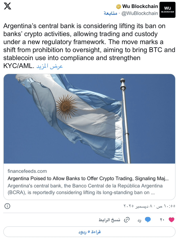 This proposal does more than update banks. It affirms the role of digital currencies as part of the financial infrastructure, not just a speculative tool. Argentina is not adding digital currencies for fun, but to combat inflation and pressures on the local currency. By allowing banks to trade and hold digital assets, regulators acknowledge that digital currencies are indeed functioning as a store of value for millions of people, and that stablecoins play a role in local payments and savings.