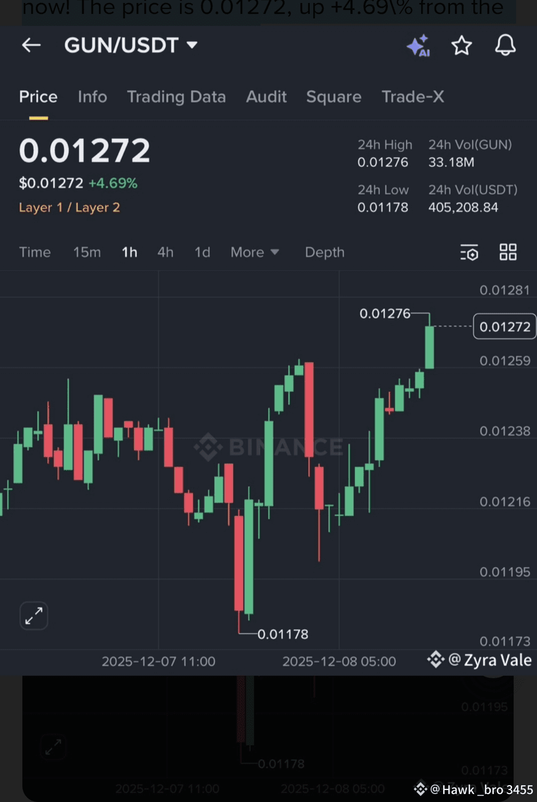 Right now GUN is moving with the kind of confidence you don’t often see in these lower-cap tokens — the kind of move where you can feel the pressure building behind every green candle. At 0.01272, sitting nearly +4.7% higher than where it opened the day, it isn’t just drifting upward — it’s pressing forward, leaning hard against its own 24-hour ceiling at 0.01276, almost taunting it, almost daring it to break.