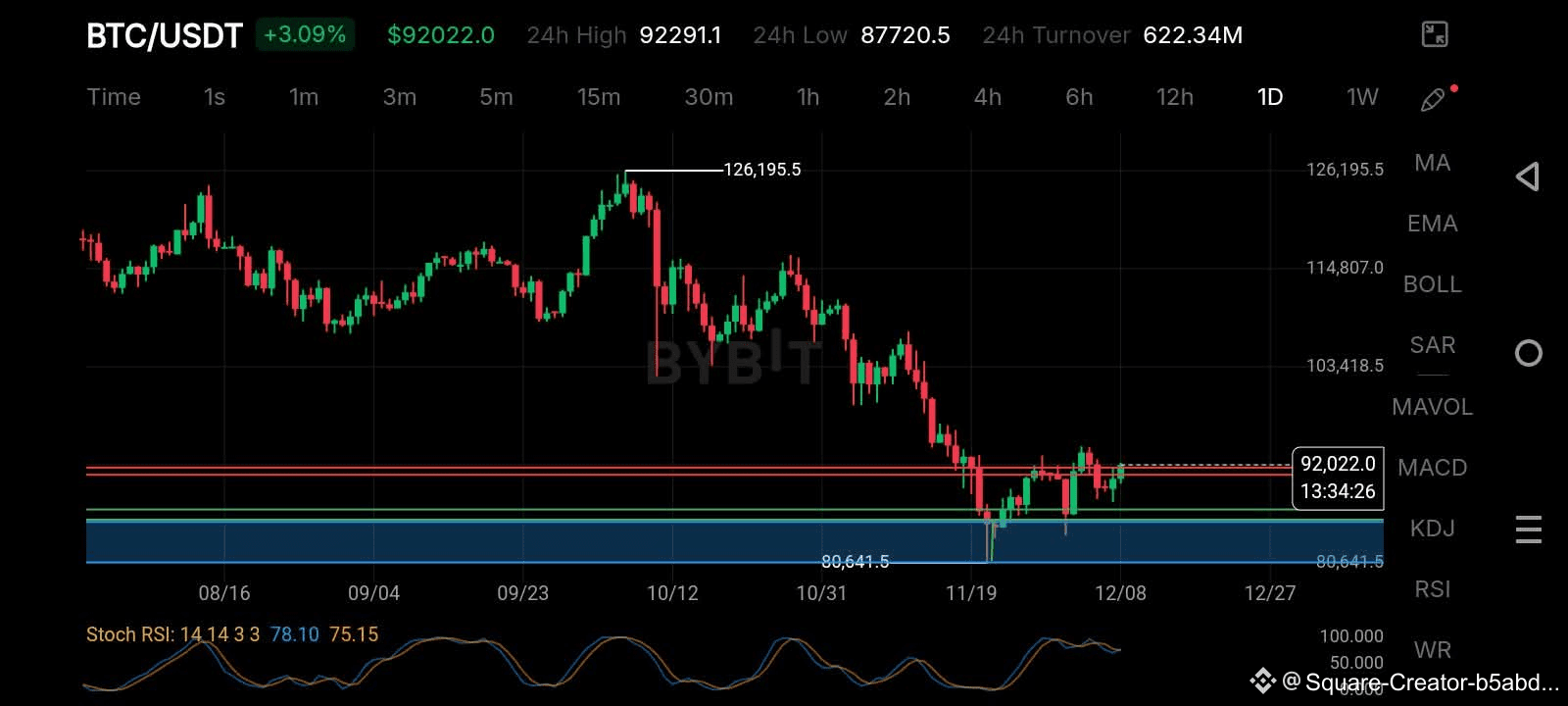 يتداول البتكوين حاليًا حول 92,000$ بعد ارتداد قوي من منطقة دعم رئيسية عند 80,600$، وهي منطقة شراء مهمة احترمها السعر سابقًا وشهدت دخول طلب واضح.