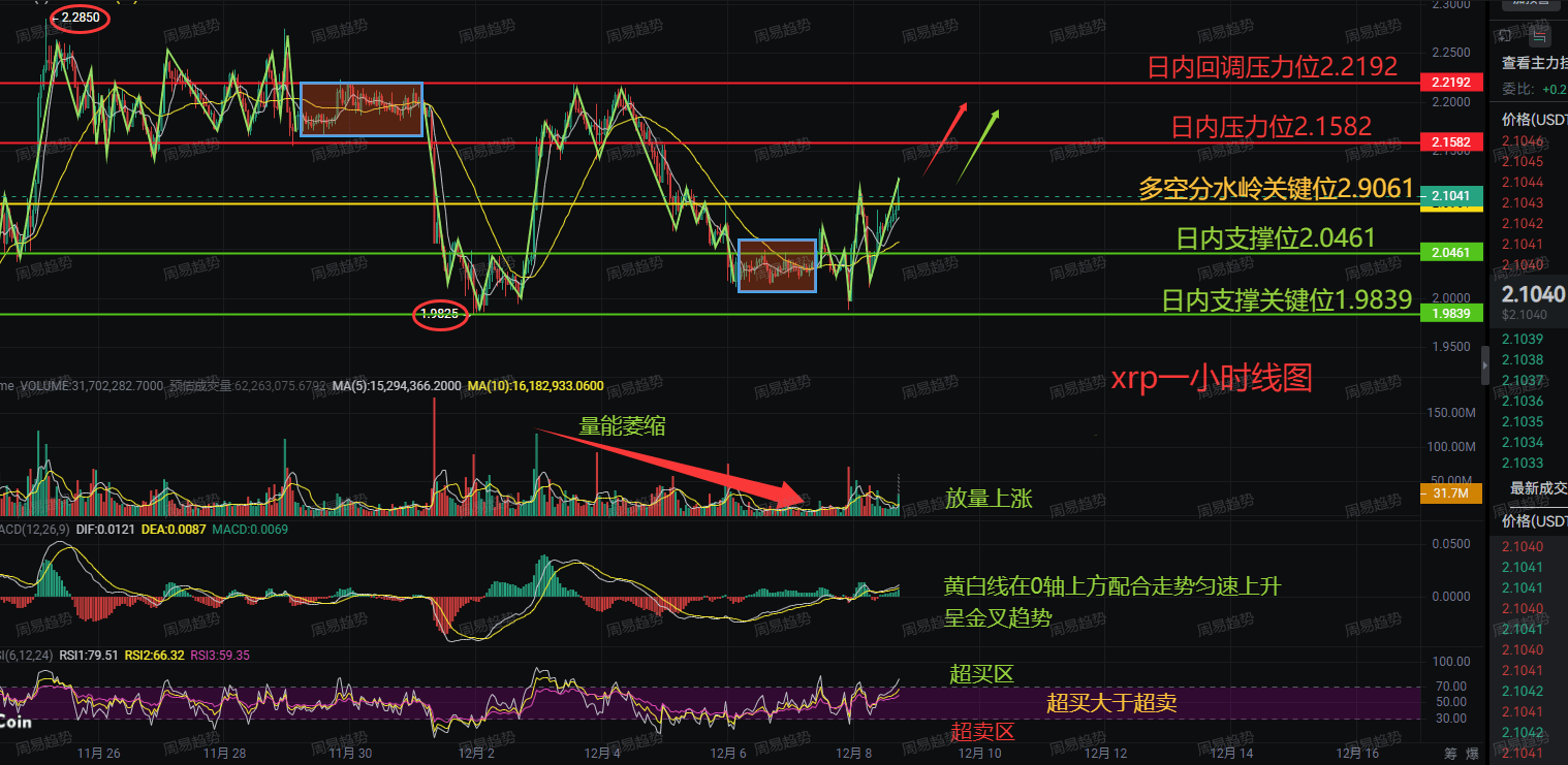 I believe that tonight XRP will first test upwards at 2.1582, but it’s likely to fall back without reaching 2.2192. The main force will not let retail investors comfortably exit at resistance levels easily, likely resulting in a 'false breakout with a true pullback'. If it pulls back, the range of 2.0461-2.1582 can be used to gradually take profits on rebounds, but once it breaks below 2.0461, wait until around 1.9839 to consider bottom-fishing!