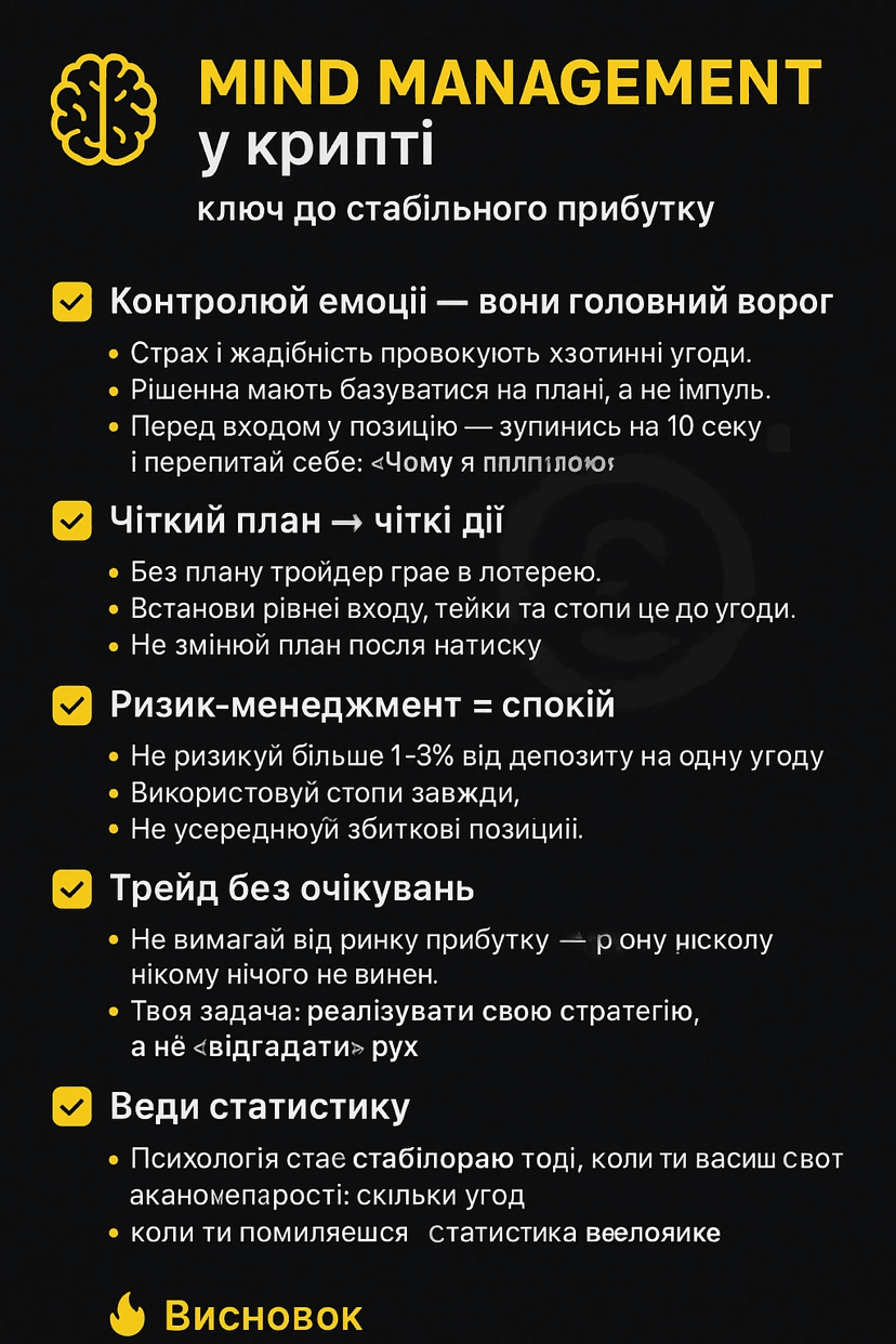 In the crypto market, it is not the one who knows more that wins — but the one who controls their mind and actions. 80% of a trader's success is psychology, not strategy. Below are the main principles of mind management, without which it is impossible to earn consistently.