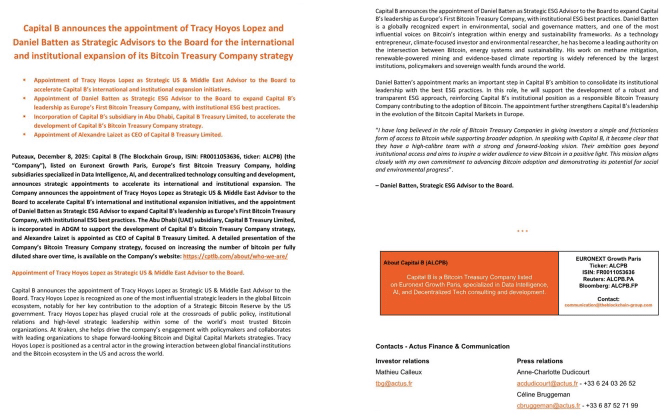 Capital B is preparing to enter a new growth phase. The European treasury firm specializing in $BTC has added prominent strategic advisors to its board. This move aims to accelerate expansion in the United States and the Middle East, while enhancing the company's focus on leading ESG standards in Europe.