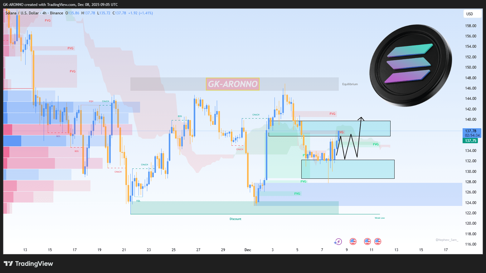 سولانا على إطار زمن 4 ساعات تظهر فقط تراجعًا طفيفًا، حيث لا تشير أي من المؤشرات الفنية أو الأخبار إلى تدفقات جديدة قوية بما يكفي لتغيير الزخم. تظل الأسعار محصورة تحت مجموعة مقاومة FVG من 138 إلى 142، ورغم حدوث ارتدادات صغيرة، فإن نطاقها الضيق يبرز نقص الشراء العدواني. تشكل سحابة إيشيموكو وFVGs العلوية المتعددة طبقة عرض سميكة، مما يتسبب في بيع كل محاولة صعود — مما يجعل الاختراق غير محتمل نسبيًا.