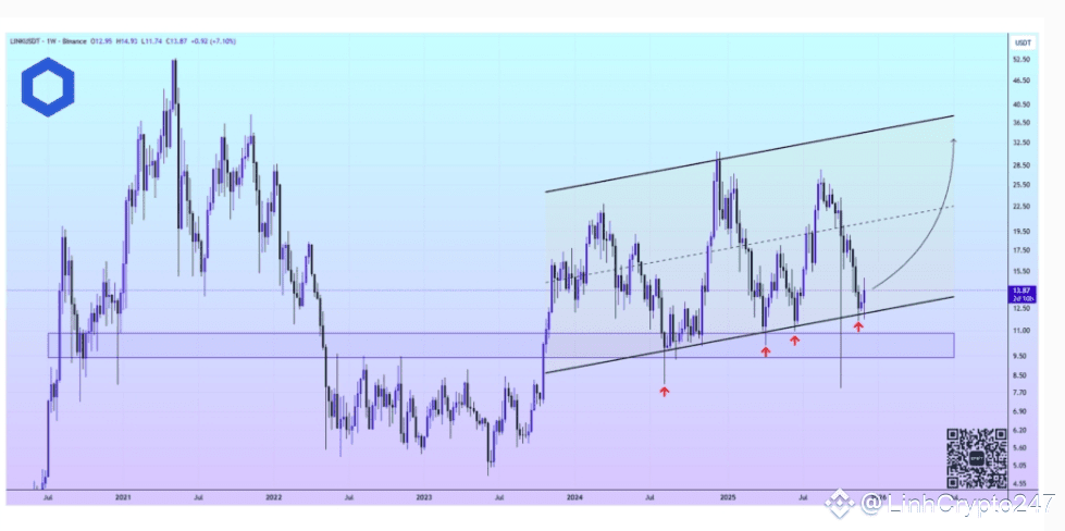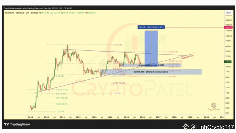 According to market analyst Crypto Patel, Chainlink has been forming a long-term accumulation structure since 2020. Despite recent pullbacks, the macro trend remains intact.