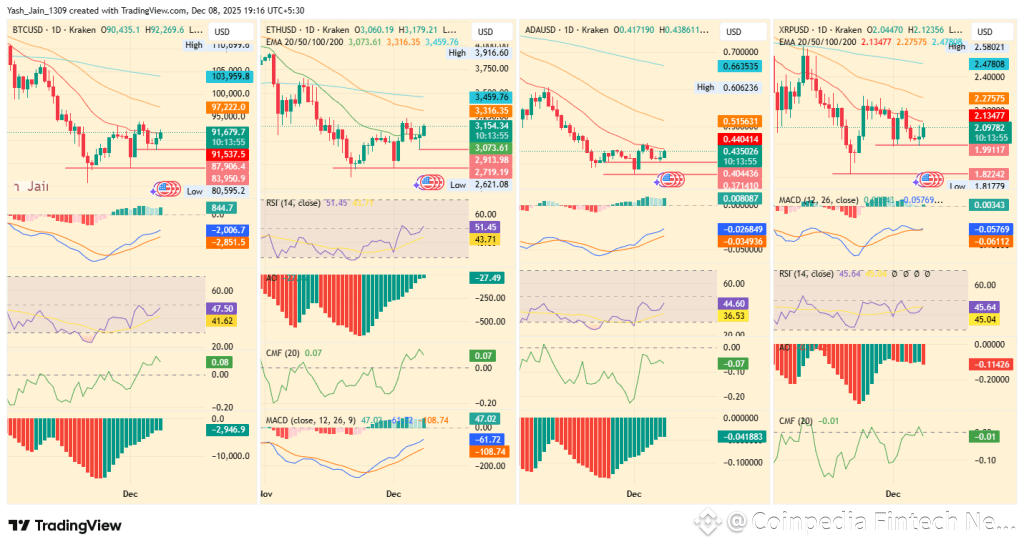 From a technical standpoint, multiple indicators across BTC, ETH, ADA, and XRP suggest the early stages of a recovery phase. The onchain chart metrics based sentiment might be cautious for now, but price momentum indicators such as RSI, MACD, AO, and CMF have flipped upward across all four assets.