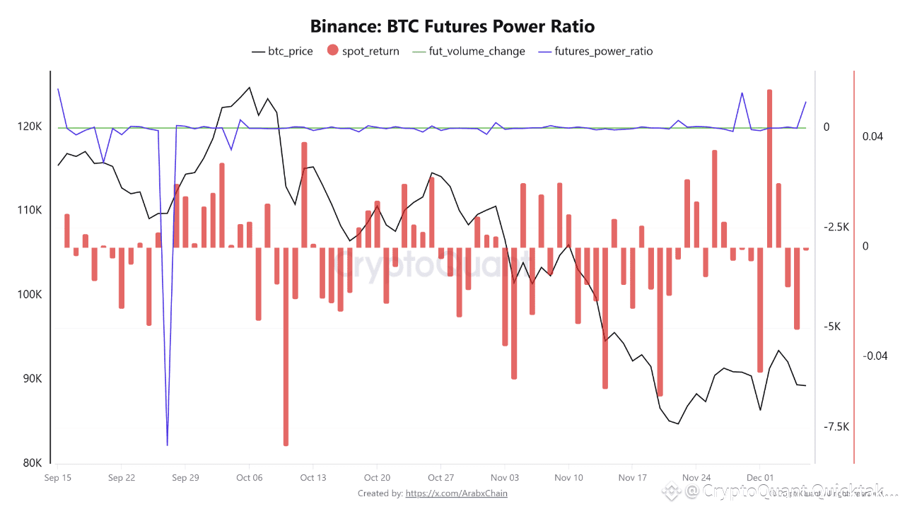 Data on the Binance platform indicates an exceptional situation in the Bitcoin market at present, with the Futures Power Ratio showing a sharp increase in the strength of futures contracts compared to the normal movement of the spot market. The indicator has reached an exceptionally high value while the spot return remains in negative territory This reveals strong and unbalanced derivatives pressure driving the market in directions that do not reflect the true buying power on the spot trading platform.