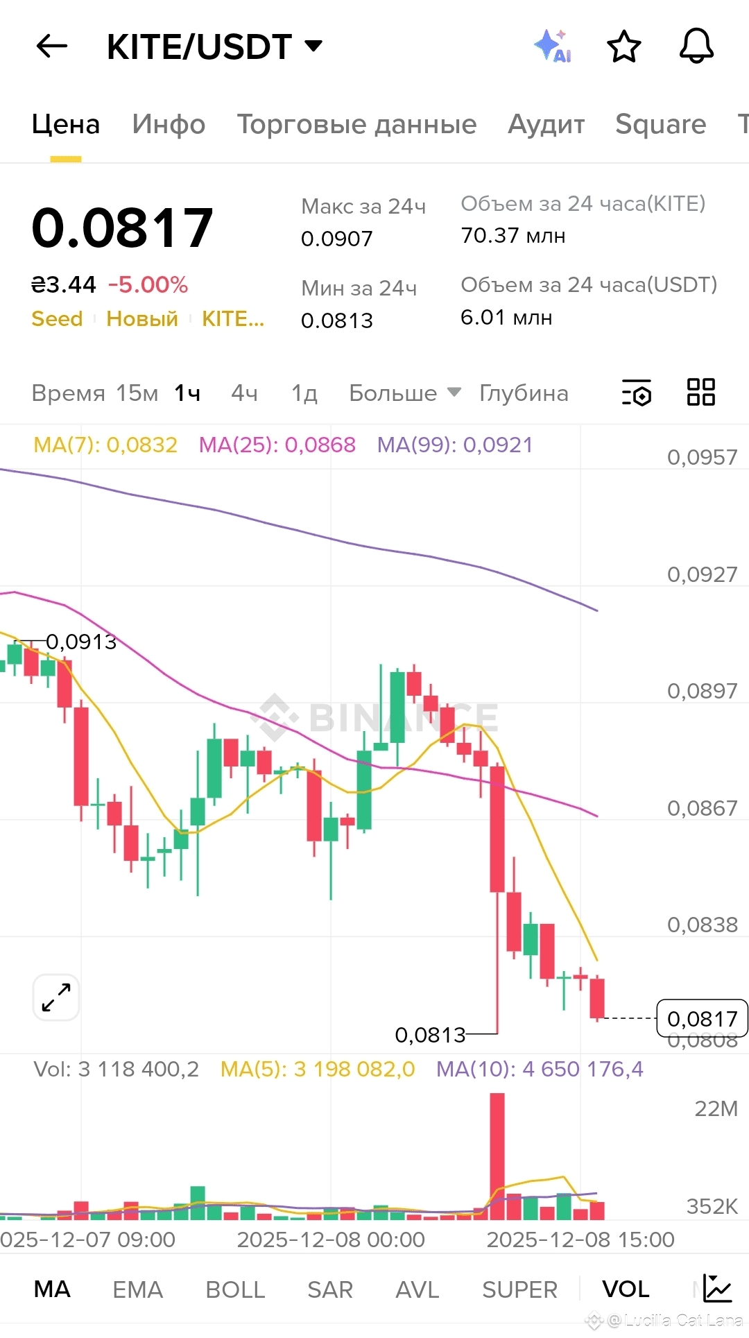 Смотрю на график $KITE и первая мысль — минус пять процентов за сутки, цена 0.0817, и это после того, как токен упал с 0.0913 до минимума 0.0813. Красные свечи, нисходящие скользящие средние, классическая картина медвежьего тренда. Но знаете, что я поняла за годы в крипте? Самые интересные возможности появляются именно тогда, когда все паникуют и продают. Когда график красный, когда все кричат, что проект умер, именно тогда умные деньги заходят на дно.