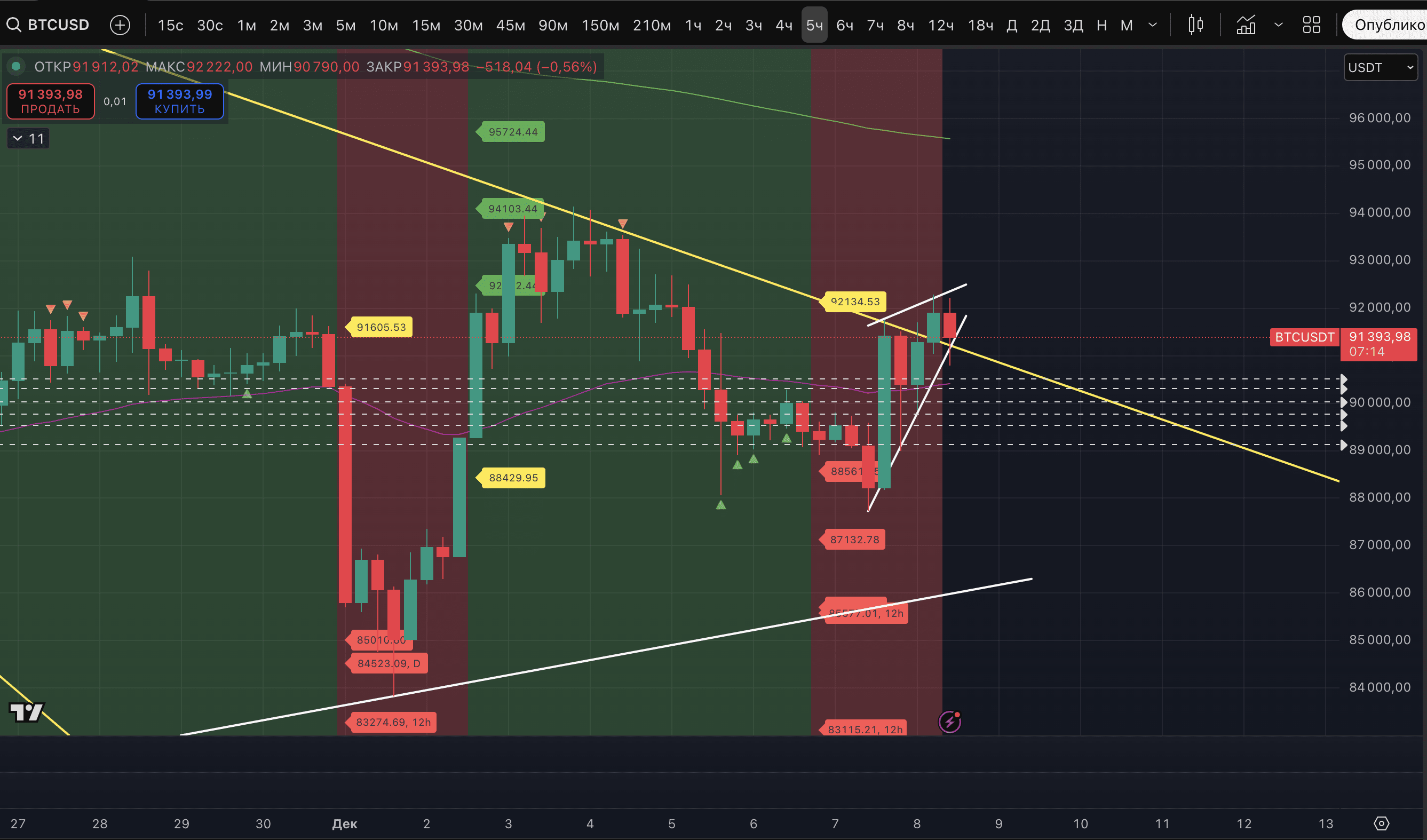 - The downtrends on the 4- and 5-hour time frames have not yet been broken and are putting pressure on the price (in the latter case, the level of potential breakdown $92,134 is being tested by an increase).