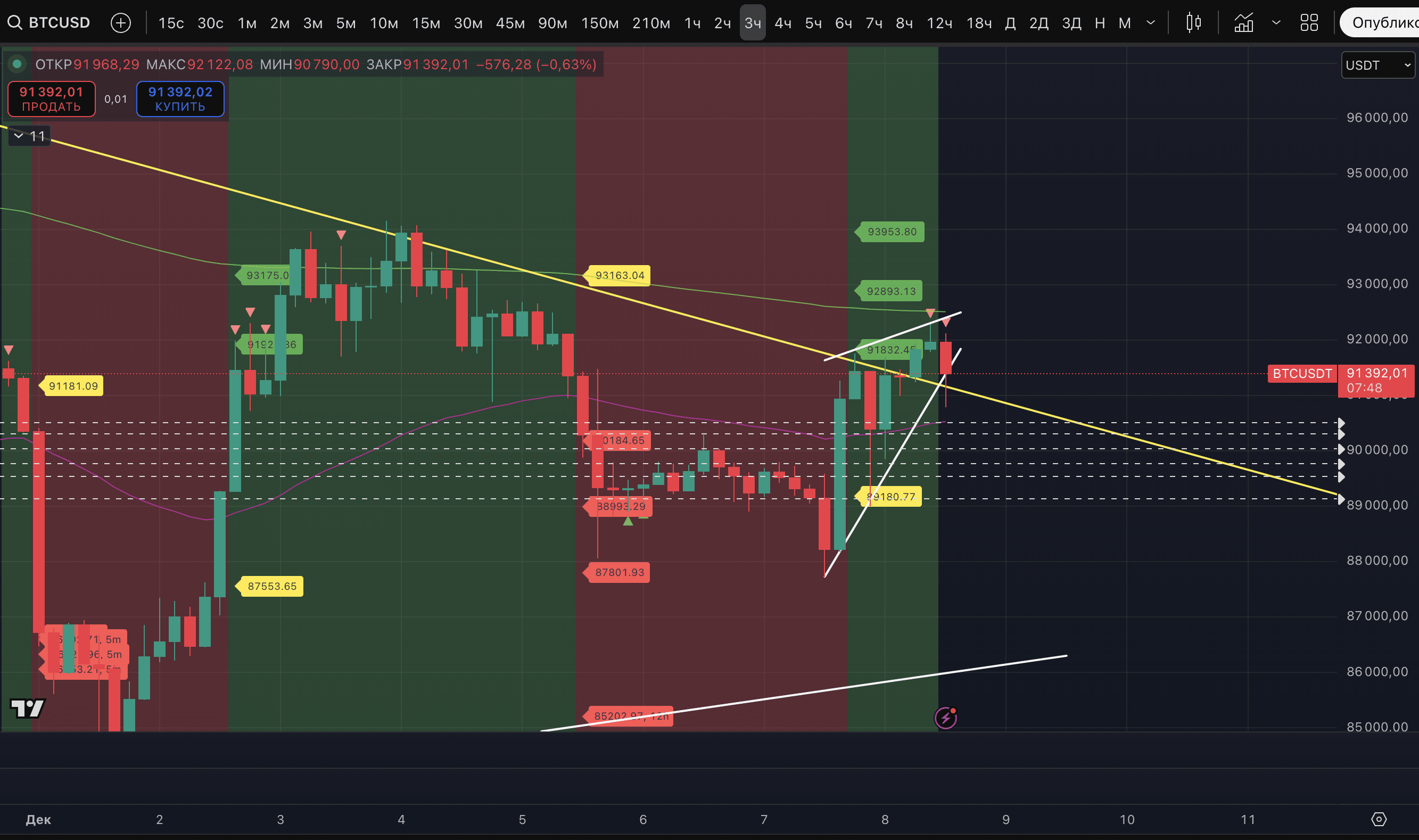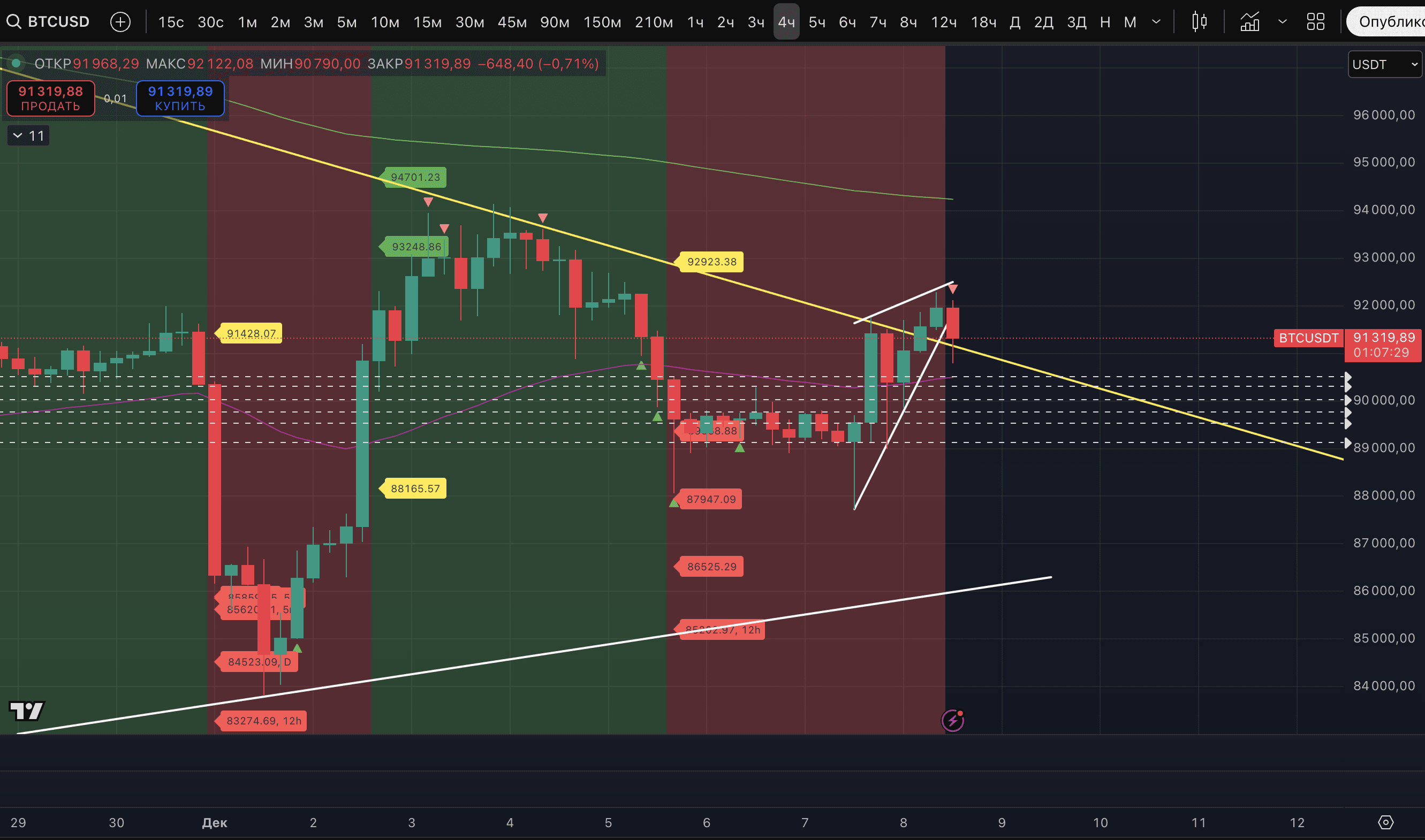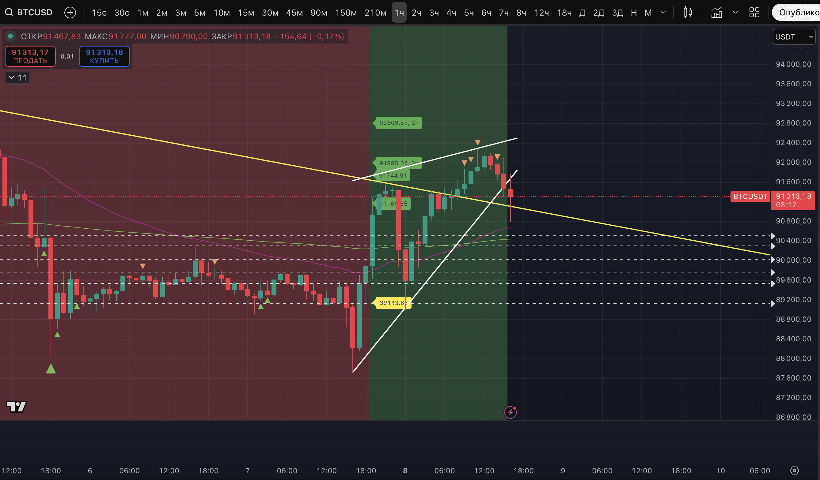 - Yesterday's rise occurred through a "Bearish Wedge" and now the price has shown a breakout and the start of its execution. So far, a retest of the breakout has been achieved on the lower time frames. The full target is around $87,650. And this is overall already close to our liquidation ($87,098). I wouldn't want to exit at the stop in breakeven, having caught a decent movement.