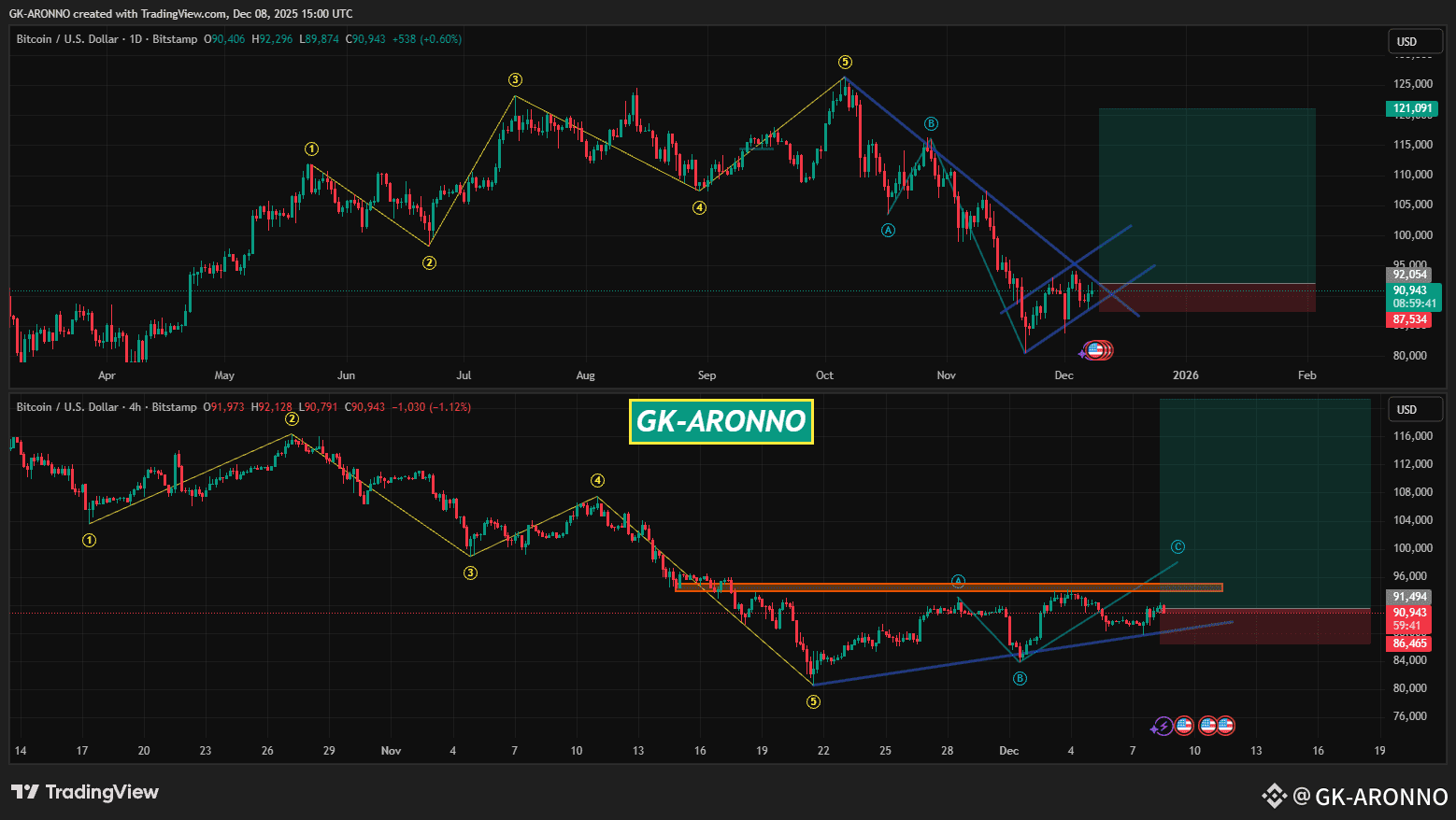 The current BTCUSD structure shows the market completing a major impulsive wave, followed by a corrective phase that is still unfolding. The correction has taken the form of overlapping subwaves, suggesting consolidation rather than a sharp reversal.