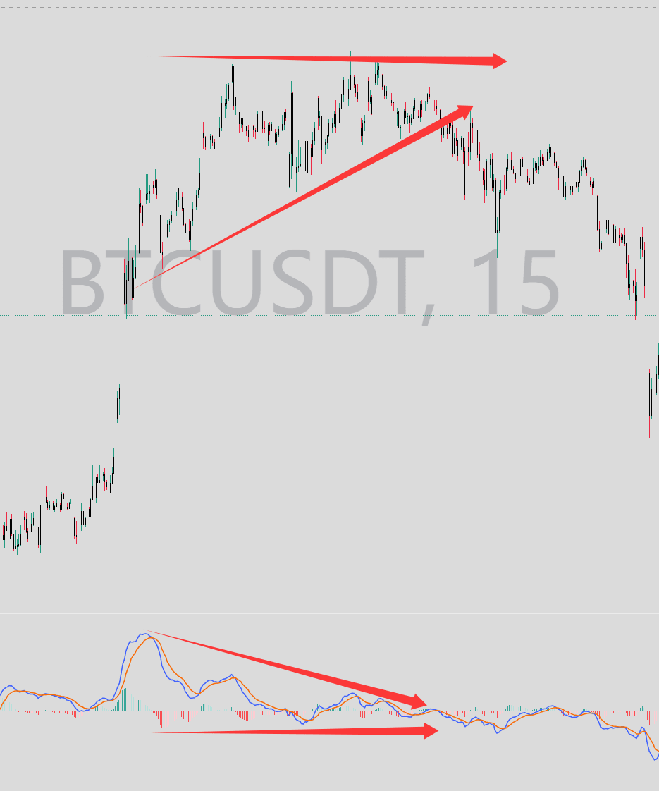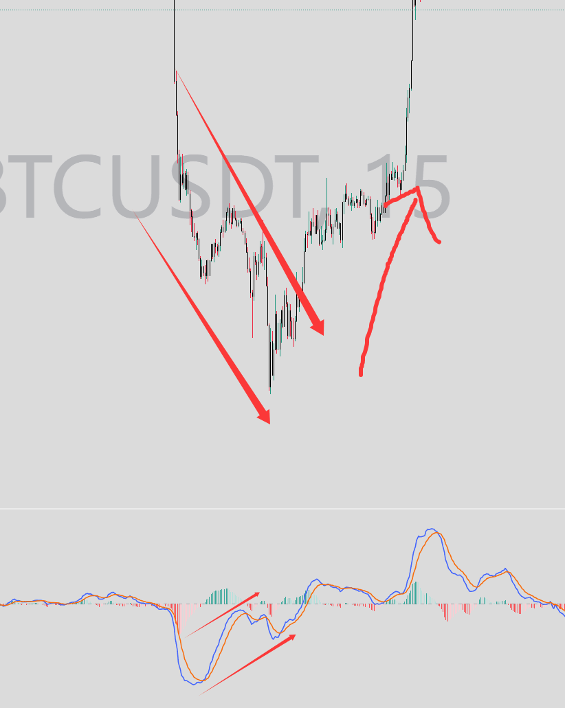 Top divergence: This means that a new high is reached, but the MACD fails to reach a new high or even declines. It indicates that the price was artificially inflated, like carrying a large bucket of water up stairs; the bullish momentum is insufficient. The 15-minute chart for BTC clearly reflects this lack of upward momentum, which will likely lead to a decline.