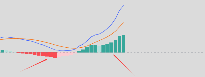 Next, let's look at our slow line, the yellow line. It's significantly slower than the blue line. This reflects the market's long-term sentiment. In other words, this month people wanted to buy groceries, but the slow line (over the past year) shows people wanted meat – it represents the average sentiment over time. When the DIF crosses above the DEA: it indicates the current sentiment is shifting from bearish to bullish. When the DIF crosses below the DEA: it indicates the current sentiment is shifting from bullish to bearish. This is just a turning point in sentiment, not a turning point in price. Price may have already turned ahead of this; the MACD is merely for confirmation.