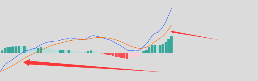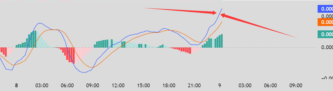 It consists of three parts: 1) the fast line DIF, 2) the slow line DEA, and 3) the red and green bars. What you need to observe is not the color, but the direction and change of momentum. Don't just look at the golden cross above the water and the death cross below the water. We need to understand its underlying logic.