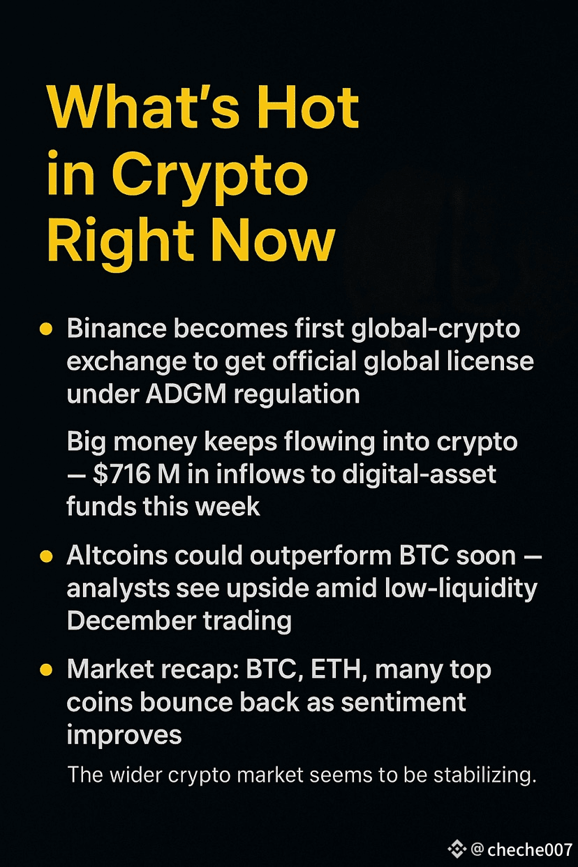 The wider crypto market seems to be stabilizing: after some recent volatility, major coins including Bitcoin and Ethereum showed strength with renewed interest in altcoins — potentially marking the start of a recovery or consolidation phase.