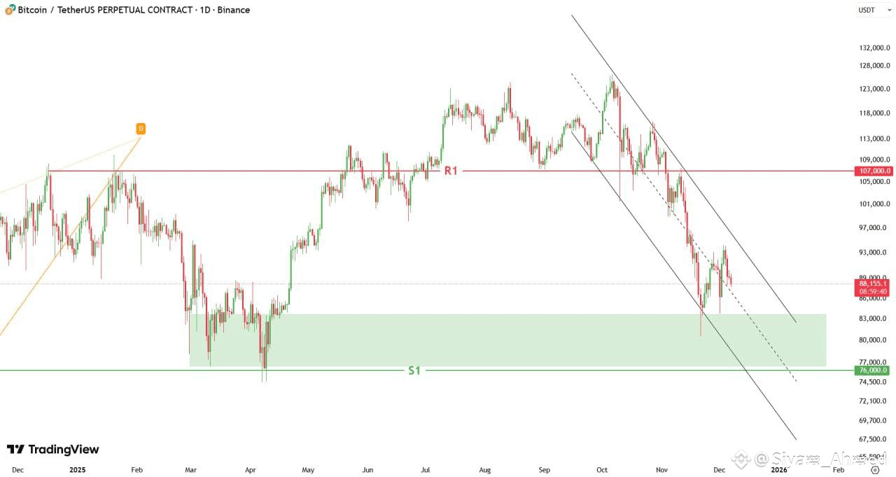 Bitcoin ($BTC) is currently trading within a well-defined descending channel, reflecting continuous bearish momentum in the short term. As the downtrend structure remains intact, price appears to be gravitating toward a major support zone around $76,000–$77,000, where buyers have previously shown strong interest.